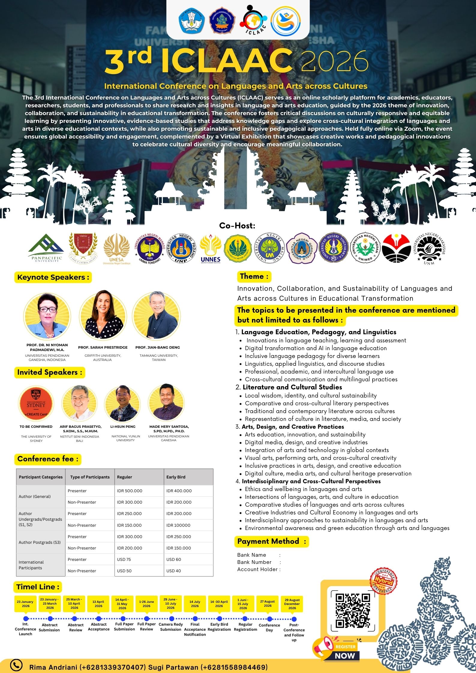 The 3rd International Conference on Languages and Arts across Cultures (ICLAAC) provides a scholarly platform for lecturers, teachers, researchers, students, and professionals to share academic insights and research in language and arts education. Aligned with the 2026 theme, Innovation, Collaboration, and Sustainability of Languages and Arts across Cultures in Educational Transformation, the conference promotes critical and forward-looking discussions that support transformative, equitable, and culturally responsive learning practices. It aims to address knowledge gaps by presenting innovative, evidence-based studies that explore how languages and arts are integrated across cultures within diverse and evolving educational settings.