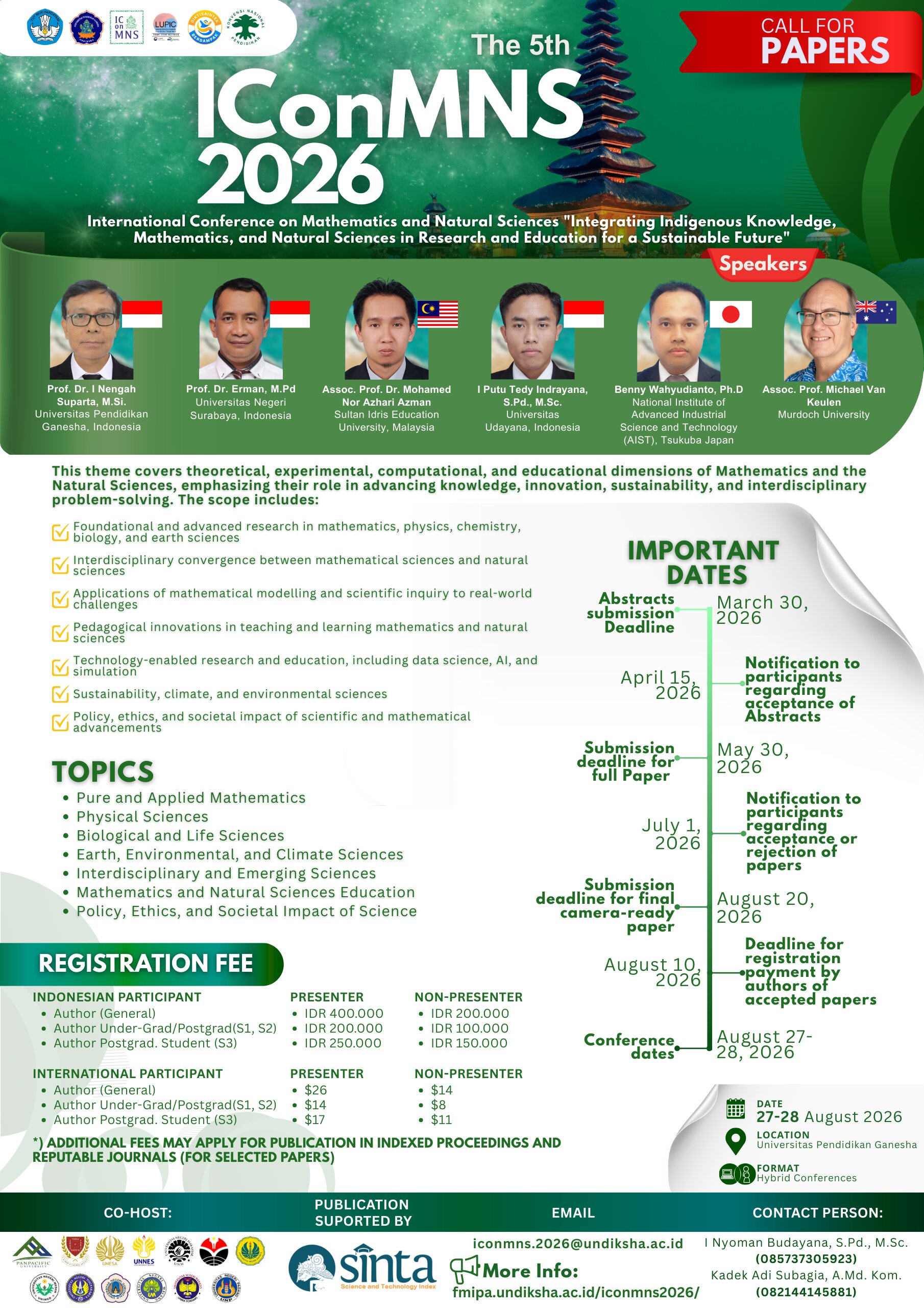 International Conference on Mathematics and Natural Sciences (IConMNS) is organized by the Faculty of Mathematics and Natural Sciences, Ganesha University of Education. The aim of the conference is to bring together experts, researchers, and scholars from all over the world to discuss the latest advancements in mathematics and natural sciences, and how they can be used to promote education and research for sustainable development. The scope of IConMNS covers various fields of studies, namely chemistry, physics, mathematics, computational science, marine science, life science, environmental science, computer science, mathematics education, physics education, chemistry education, and biology education.