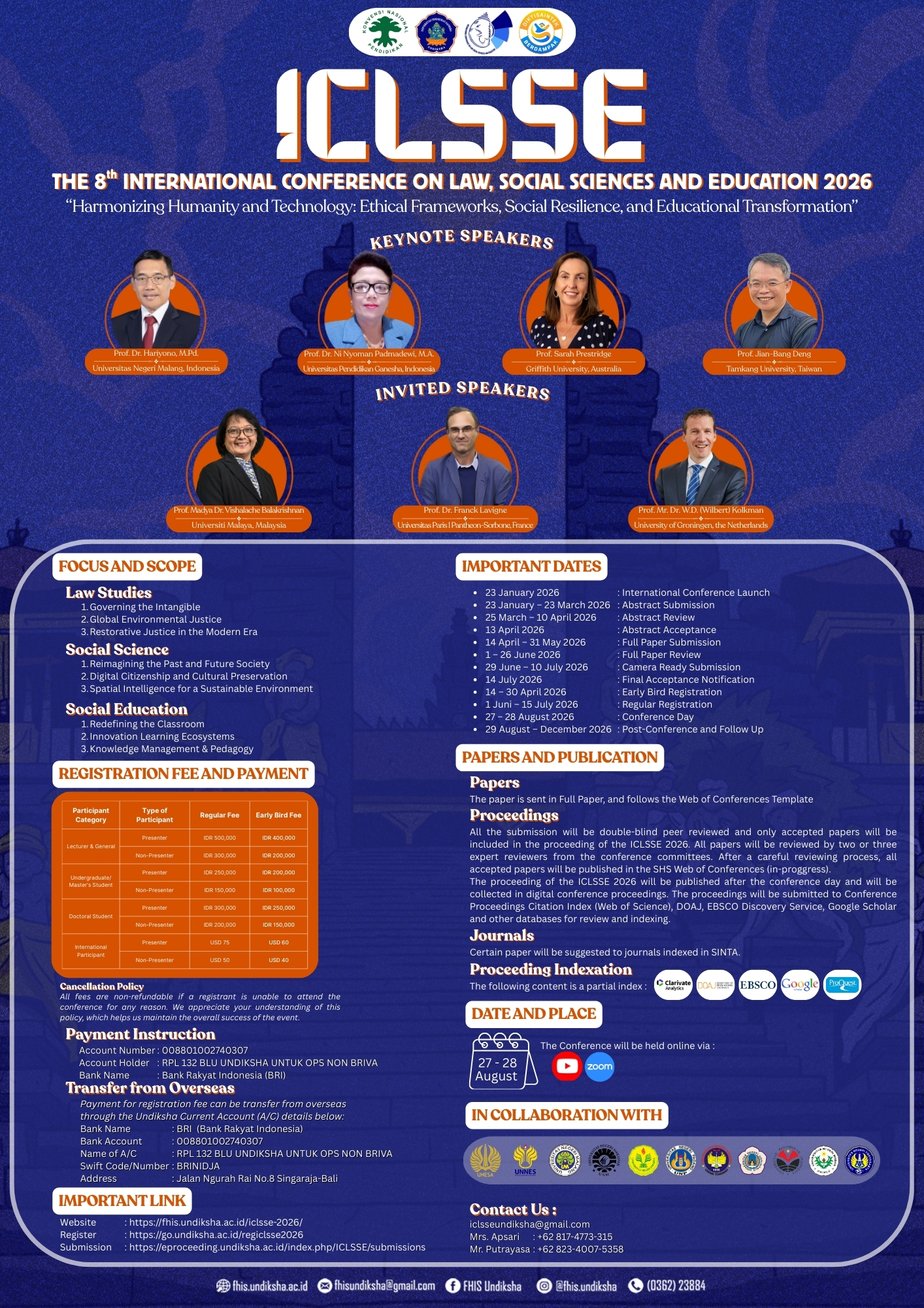 The 8th International Conference on Law, Social Sciences and Education (ICLSSE) 2026 is an international forum for disseminating knowledge and research development from researchers, practitioners, professionals, scholars and those working in law studies, humanities, social sciences, and social science education. The main objectives of the conference are: 1) to disseminate knowledge and foster discussion on the intersection of law, social sciences, and education within a digital and spatial context; 2) to provide a strategic platform for interdisciplinary academic dialogue, bridging the gap between technical sciences (such as remote sensing and data science) and humanistic studies; and 3) to prepare academics, professionals, and decision-makers to deal with the ethical and structural challenges of a sustainable, technology-driven society.