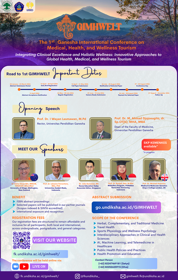 The 1st Ganesha International Conference on Medical, Health and Wellness Tourism (GIMHWELT) 2026, hosted by the Faculty of Medicine at Universitas Pendidikan Ganesha, Bali, Indonesia, is a premier global platform for medical professionals, health experts, wellness practitioners, and researchers to explore and discuss innovative approaches to integrating clinical excellence with holistic wellness in the rapidly evolving field of global health, medical, and wellness tourism. Under the theme "Integrating Clinical Excellence and Holistic Wellness: Innovative Approaches to Global Health, Medical, and Wellness Tourism," GIMHWELT 2026 aims to foster interdisciplinary dialogue and collaboration among scholars, practitioners, and industry leaders. This conference will provide a unique opportunity to share cutting-edge research, best practices, and transformative ideas that shape the future of medical and wellness tourism. This year, GIMHWELT will be conducted in an online format, ensuring broader accessibility and participation for attendees from around the globe. It is also organized as part of the International Joint Conference of Konaspi (Konvensi Nasional Pendidikan Indonesia) 2026 hosted by Universitas Pendidikan Ganesha, further enhancing collaboration and knowledge exchange among national and international scholars and practitioners. We warmly invite healthcare professionals, researchers, wellness experts, policymakers, and industry stakeholders to contribute to this dynamic academic exchange. Join us in shaping the future of global health, medical, and wellness tourism through innovation, collaboration, and excellence.